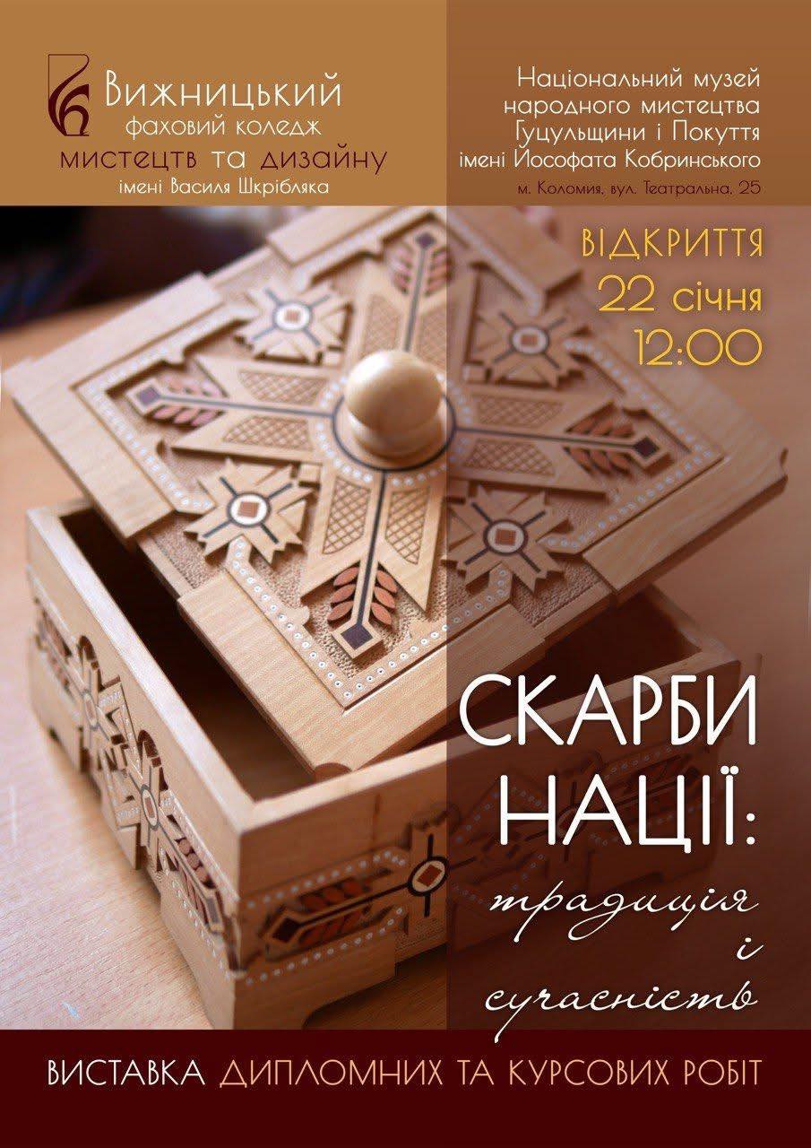 Двадцять другого січня, у День Соборності України, у Національному музеї народного мистецтва Гуцульщини та Покуття відбулося урочисте відкриття виставки «Скарби нації: традиція і сучасність» – виставки курсових та дипломних робіт студентів Вижницького фахового коледжу мистецтв та дизайну імені Василя Шкрібляка.