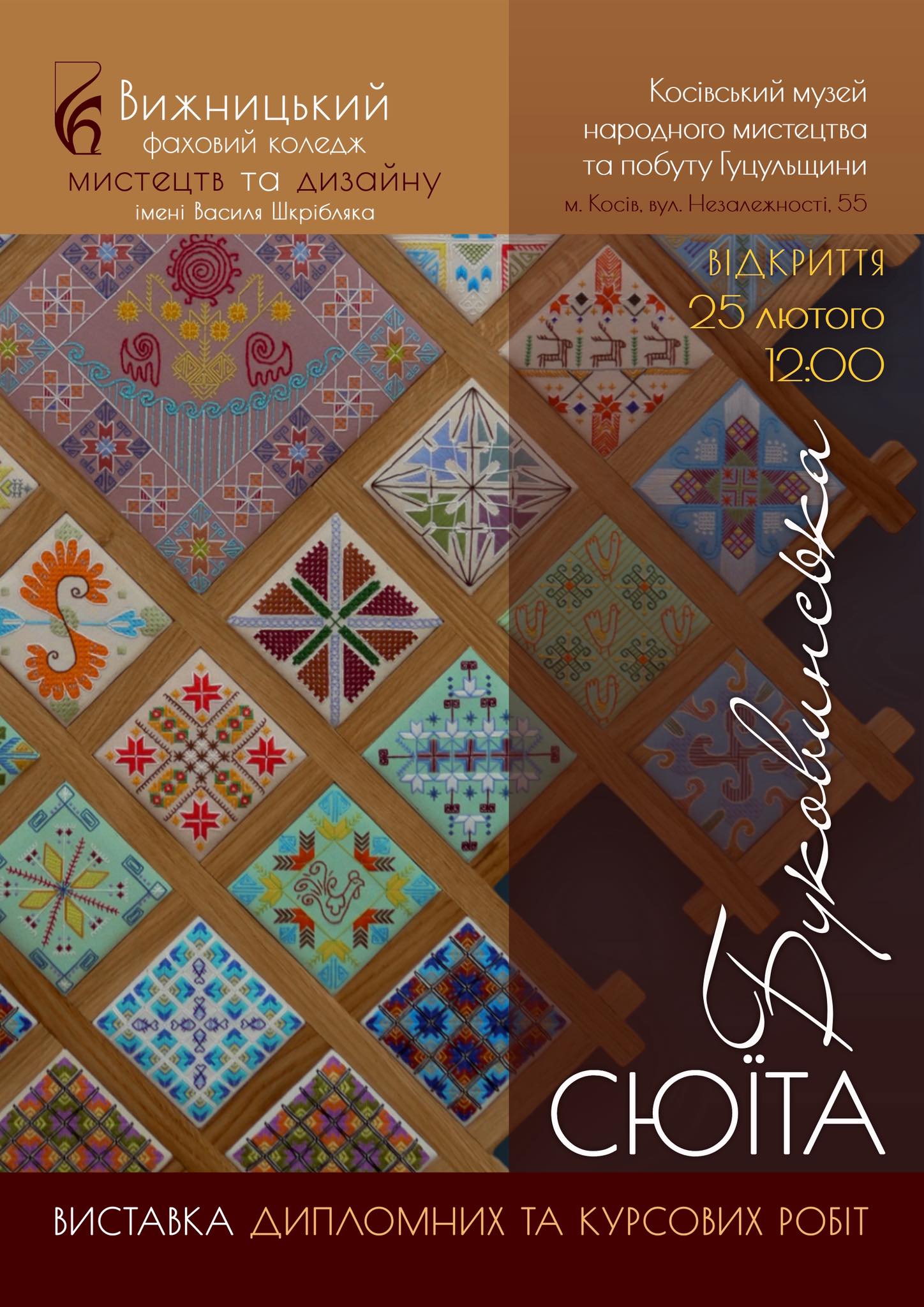 Виставка дипломних та курсових робіт студентів Вижницького фахового коледжу мистецтв та дизайну імені Василя Шкрібляка діятиме до кінця березня 2026 року.